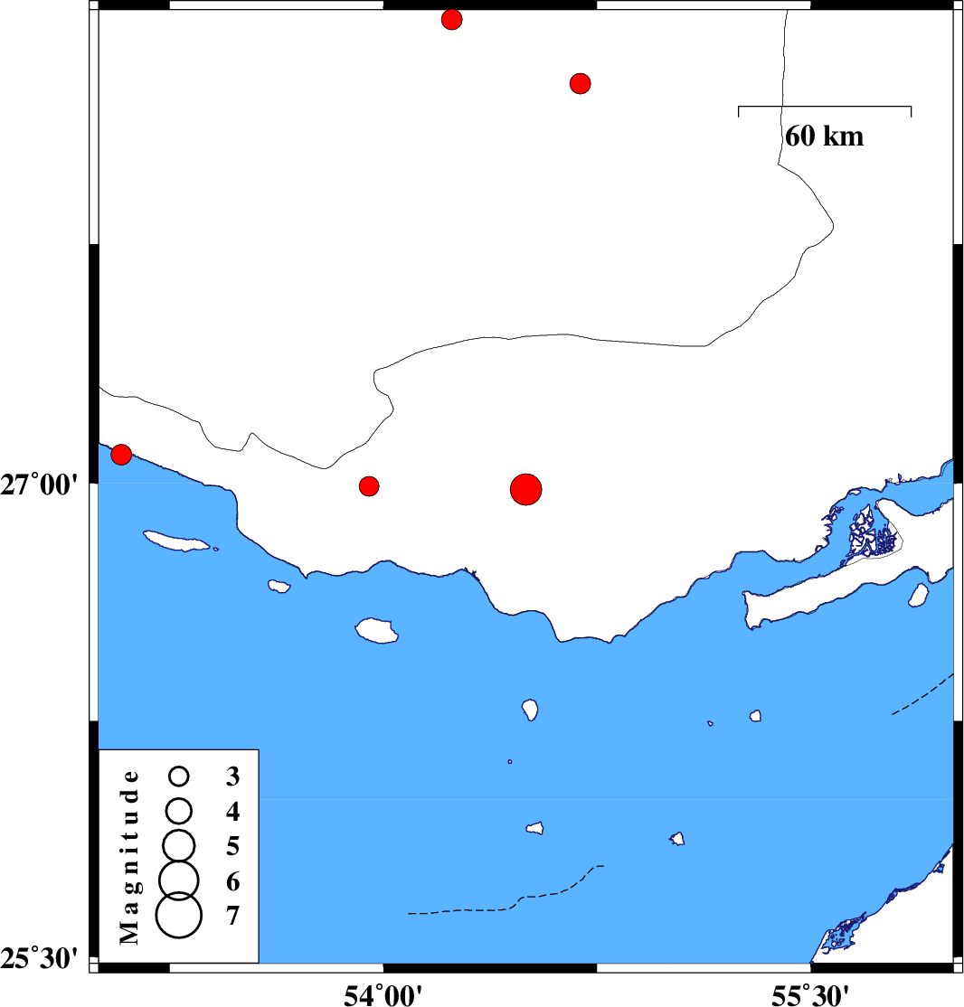| 2010/09/07 | 02:53:45.7 | 07:23:45.7 | 27.09 | 53.08 | 17 | ML:3.2 | Persian Gulf, 28 km South of Lamerd | ||