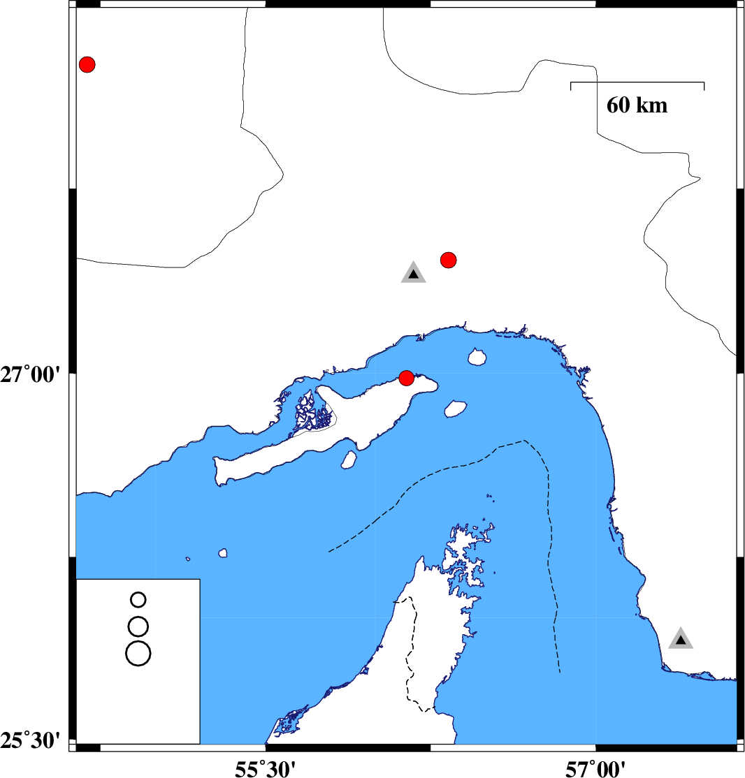 2010/09/07 | 04:50:50.4 | 09:20:50.4 | 26.98 | 56.14 | 27 | ML:3.1 | Persian Gulf, 13 km West of Qeshm | ||