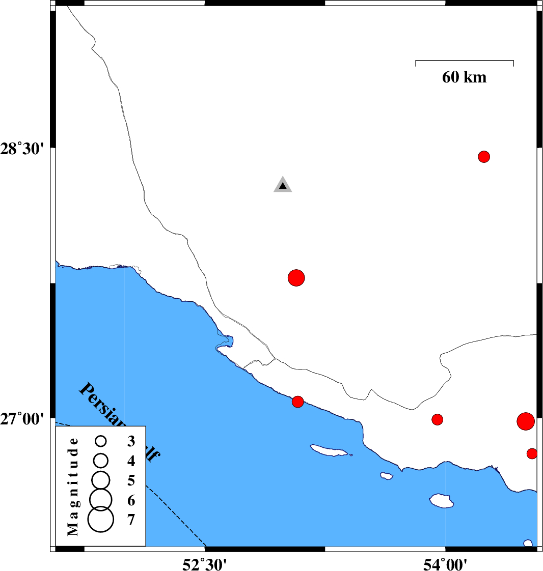 2010/09/03 | 03:17:53.2 | 07:47:53.2 | 26.99 | 53.95 | 14 | ML:3.1 | Hormozgan Province, 47 km South-West of Bastak |