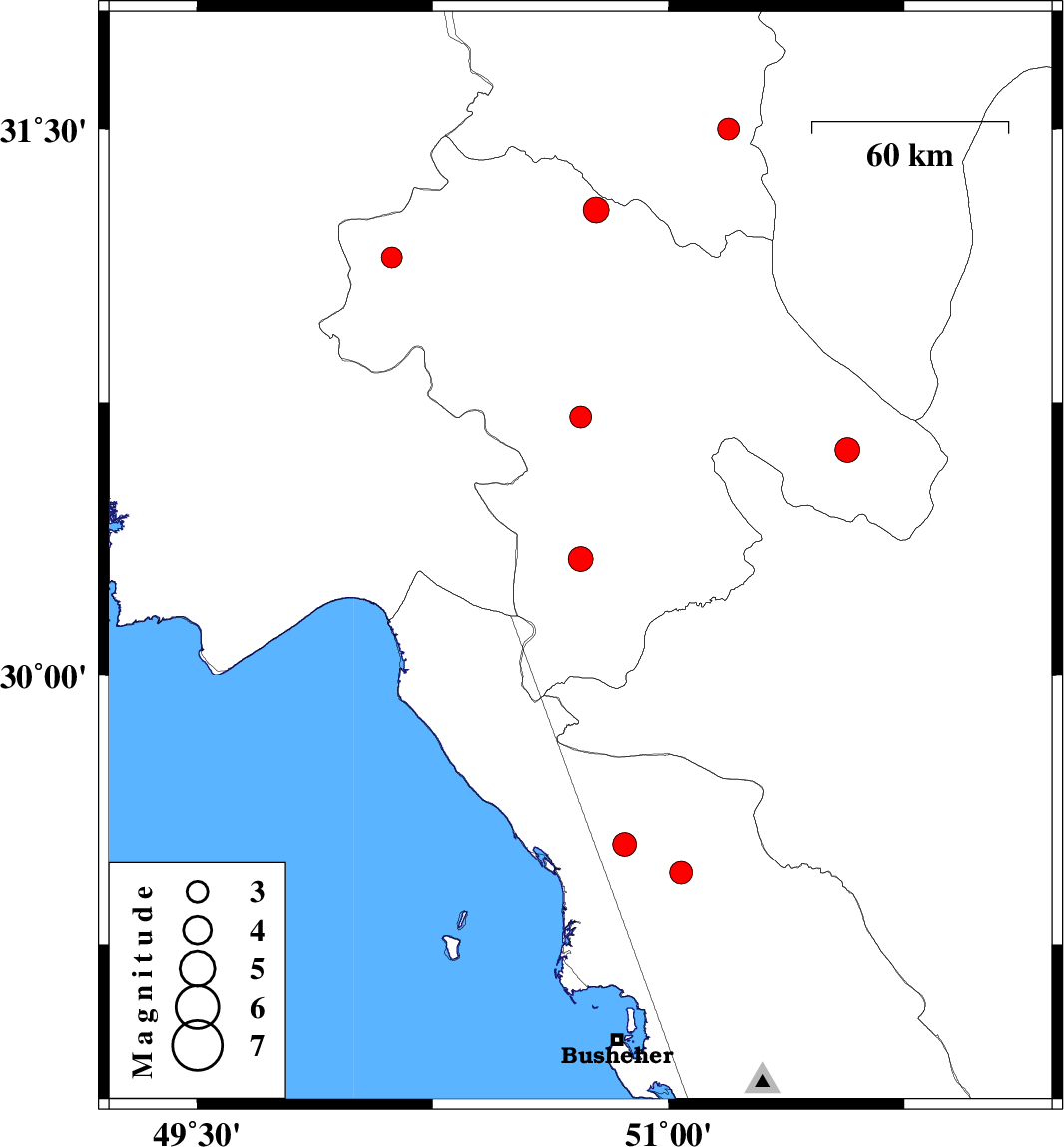 | 2010/08/15 | 01:48:48.7 | 06:18:48.7 | 29.45 | 51.04 | 18 | ML:3.2 | Bushehr Province, 26 km North-West of Borazjan |