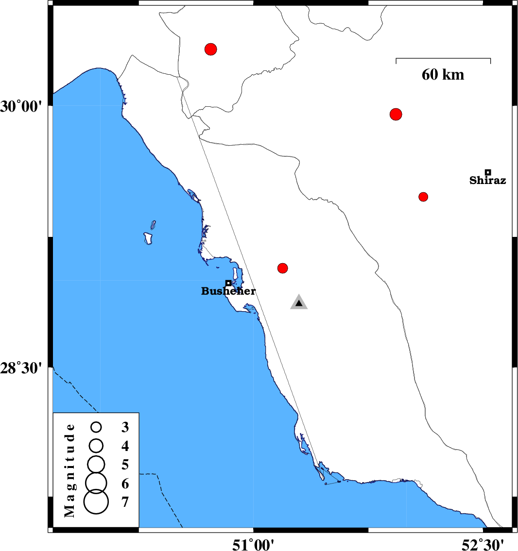 | 2010/09/20 | 08:21:50.4 | 12:51:50.4 | 29.07 | 51.19 | 17 | ML:2.9 | Bushehr Province, 21 km South of Borazjan | ||