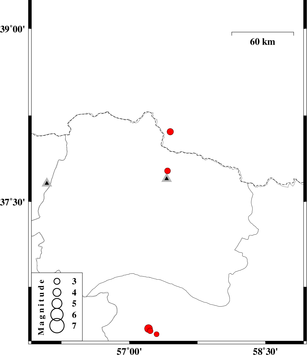 | 2010/09/23 | 13:59:44.8 | 17:29:44.8 | 37.77 | 57.42 | 14 | ML:2.9 | Khorasan(north) Province, 34 km North of Bojnurd | ||