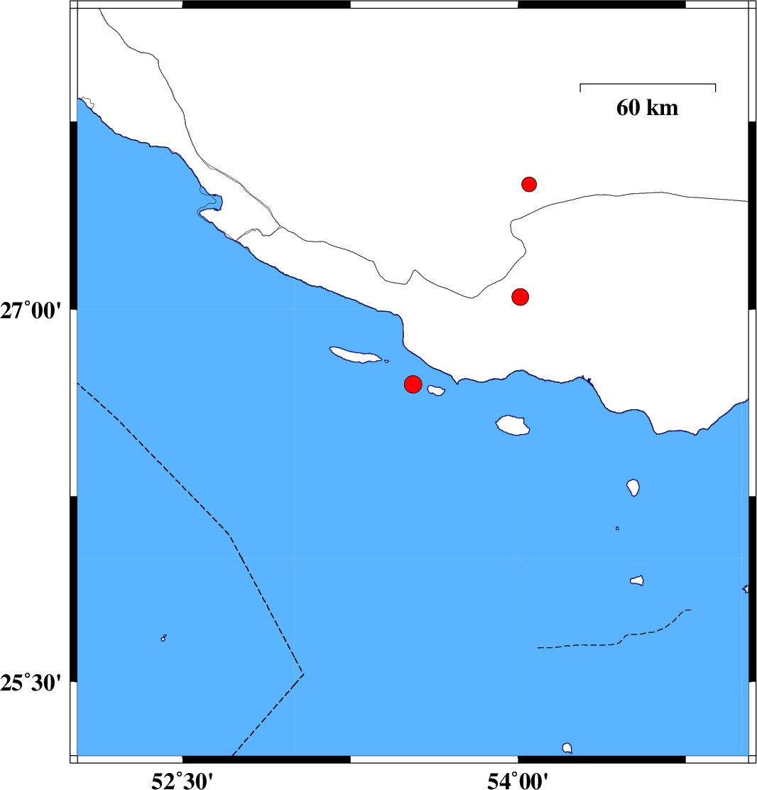 | 2010/09/27 | 05:53:42.5 | 09:23:42.5 | 26.7 | 53.53 | 46 | ML:3.5 | Persian Gulf, 79 km South-East of Lamerd | ||