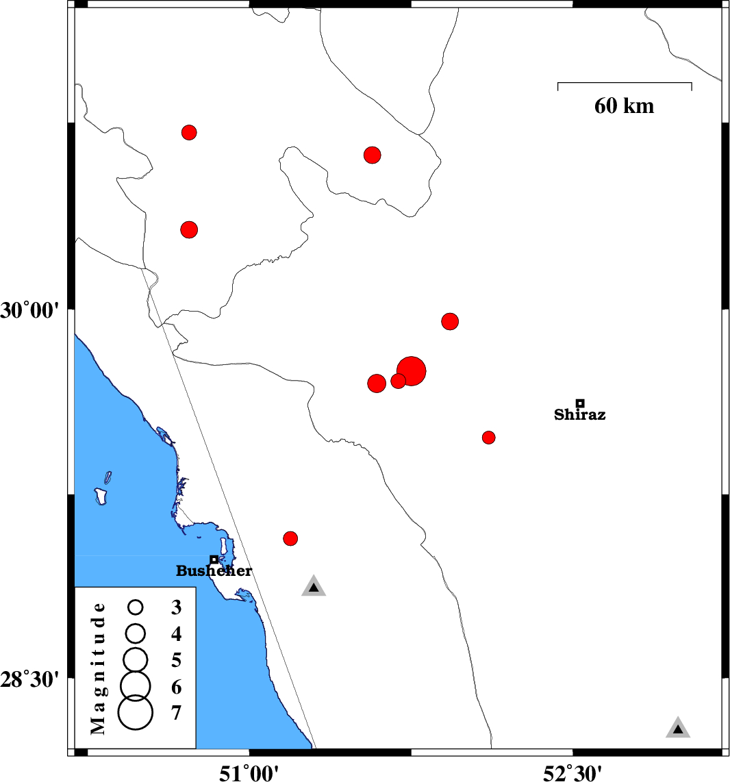 | 2010/09/27 | 11:22:44.6 | 14:52:44.6 | 29.75 | 51.75 | 15 | ML:6 | Fars Province, 17 km North of Kazerun | ||