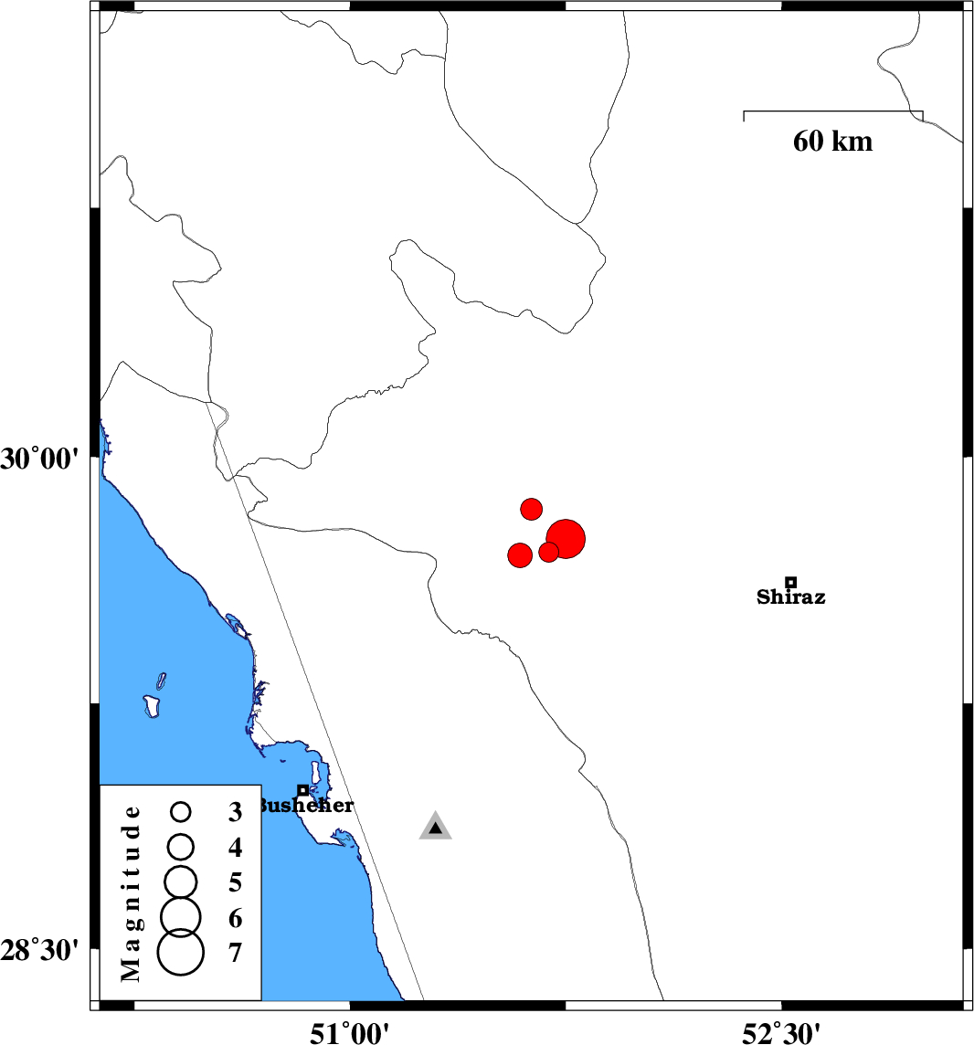 | 2010/09/27 | 11:22:44.6 | 14:52:44.6 | 29.75 | 51.75 | 15 | ML:6 | Fars Province, 17 km North of Kazerun |