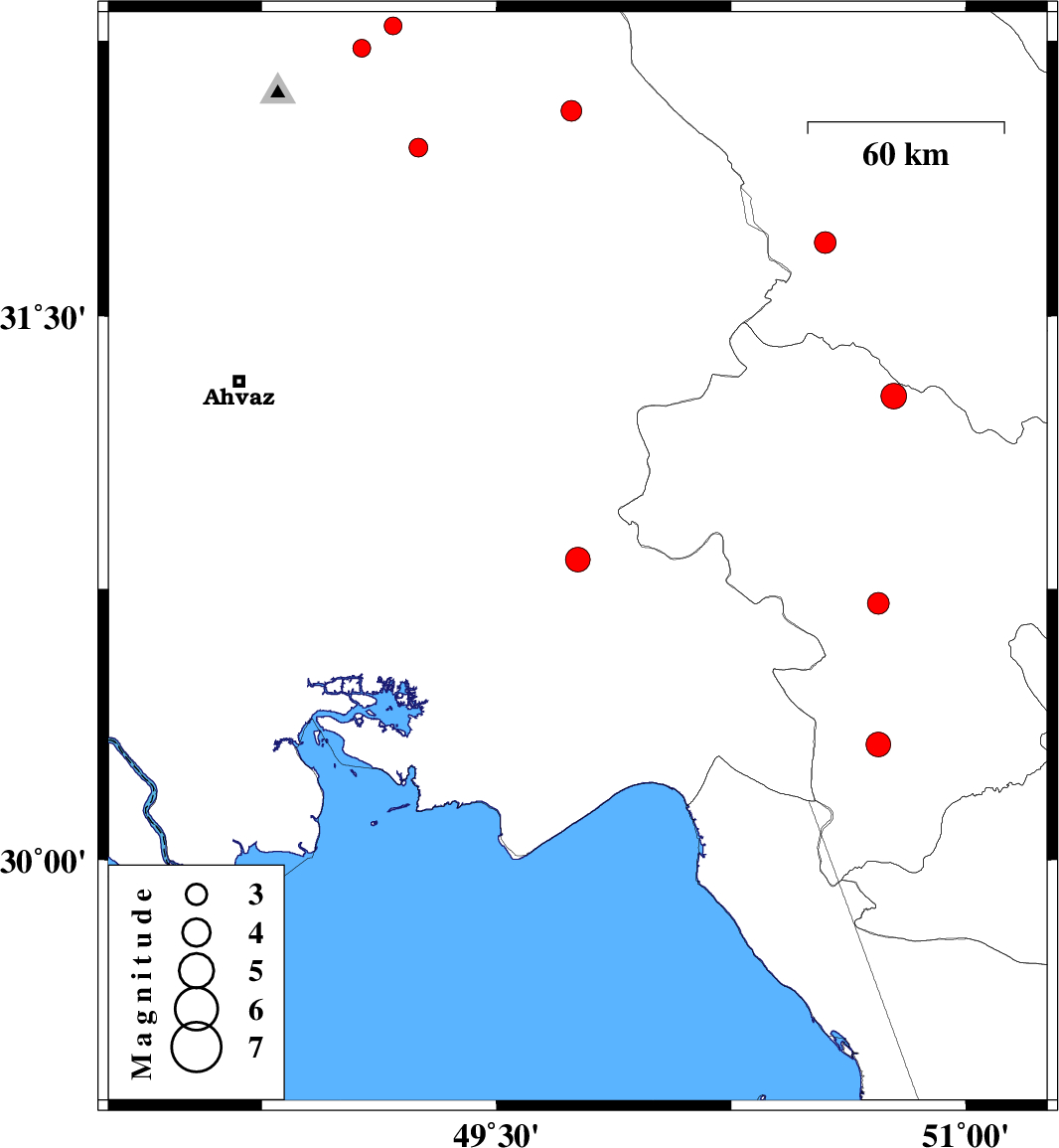 | 2010/09/05 | 06:56:13.7 | 11:26:13.7 | 30.71 | 50.72 | 15 | ML:3.1 | Kohkiluieh va boyerahmad Province, 17 km East of Dehdasht | ||