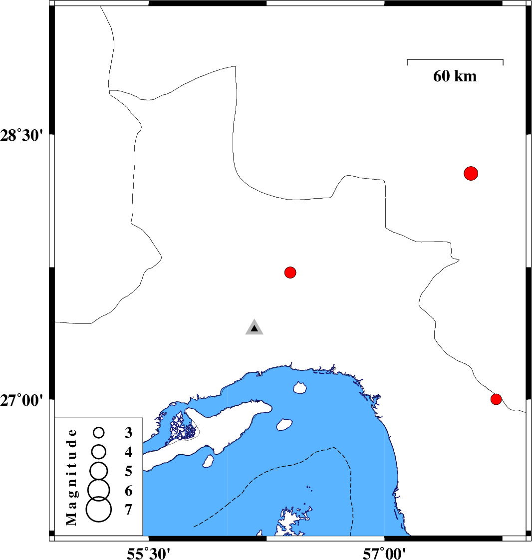 | 2010/09/29 | 09:51:58.7 | 13:21:58.7 | 27 | 57.71 | 15 | ML:3.1 | Hormozgan Province, 51 km South-East of Manujan | ||
