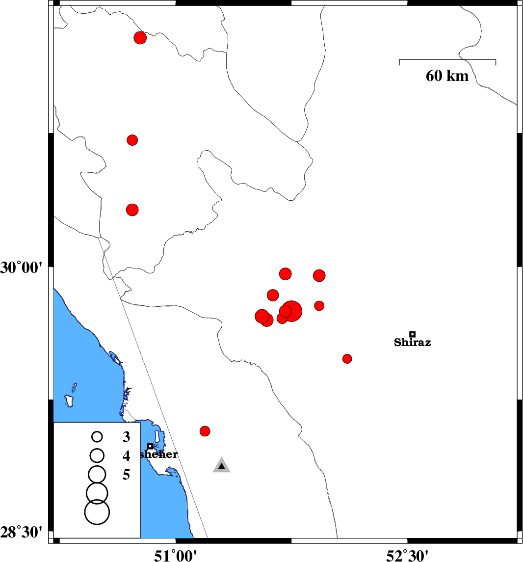 2010/09/20 | 08:21:50.4 | 12:51:50.4 | 29.07 | 51.19 | 17 | ML:2.9 | Bushehr Province, 21 km South of Borazjan | ||