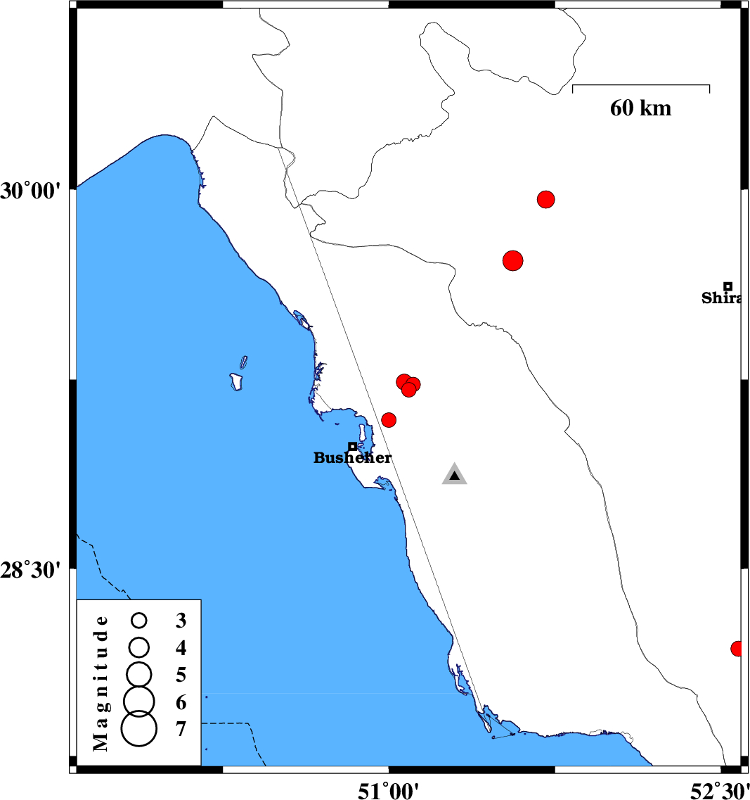 | 2010/10/09 | 00:22:09.8 | 03:52:09.8 | 29.21 | 51.09 | 18 | ML:3 | Bushehr Province, 12 km West of Borazjan | ||