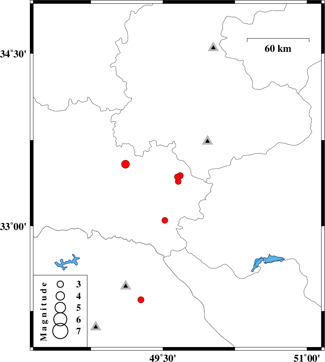 | 2010/10/06 | 07:54:04.1 | 11:24:04.1 | 33.05 | 49.52 | 17 | ML:2.8 | Lorestan Province, 46 km South of Azna |