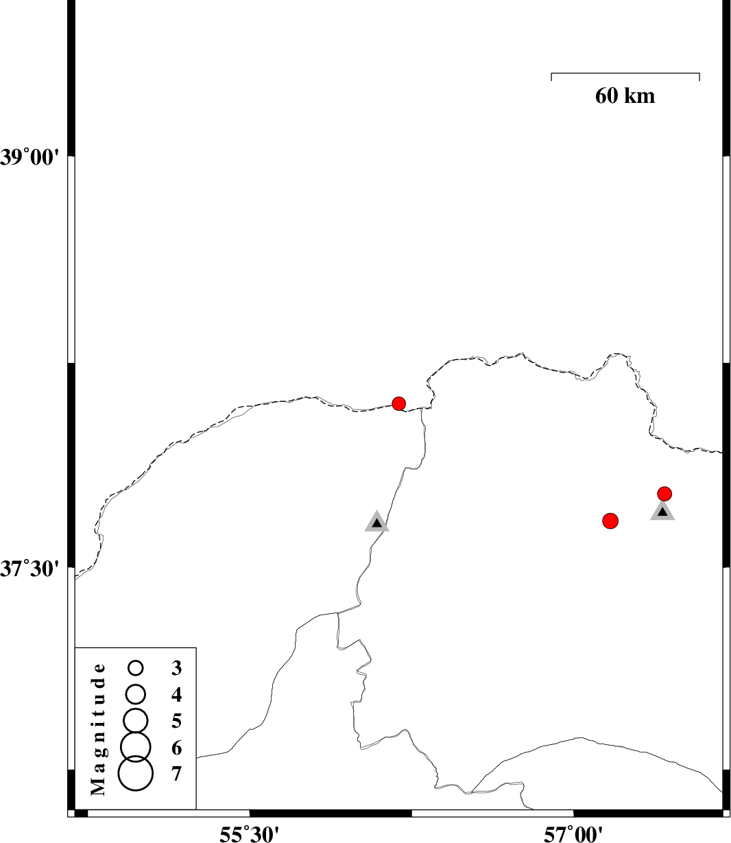 | 2010/09/23 | 13:59:44.8 | 17:29:44.8 | 37.77 | 57.42 | 14 | ML:2.9 | Khorasan(north) Province, 34 km North of Bojnurd |