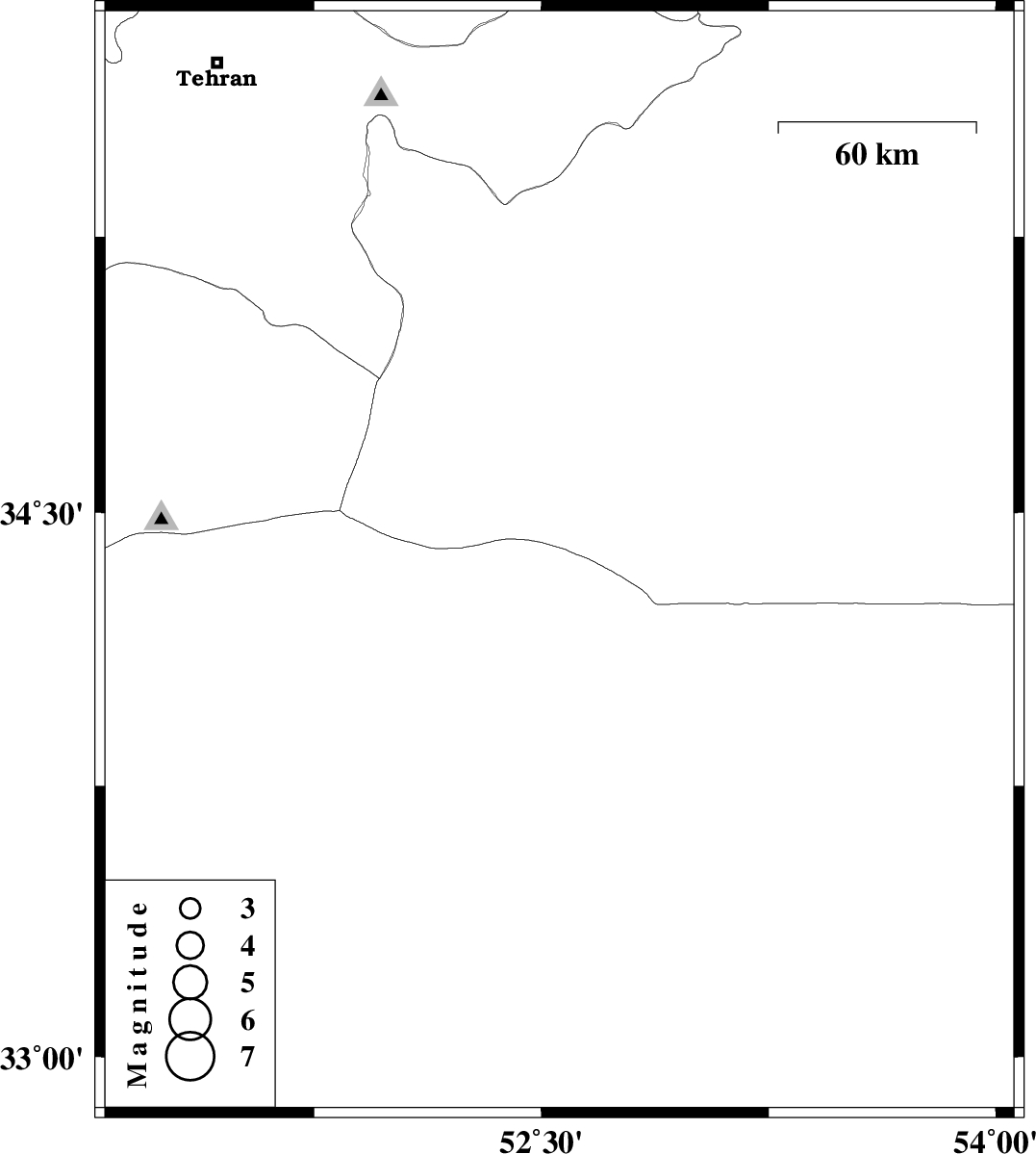 | 2010/10/26 | 18:58:31.8 | 22:28:31.8 | 34.36 | 52.56 | 37 | ML:2.6 | Esfahan Province, 98 km South-East of Garmsar |
