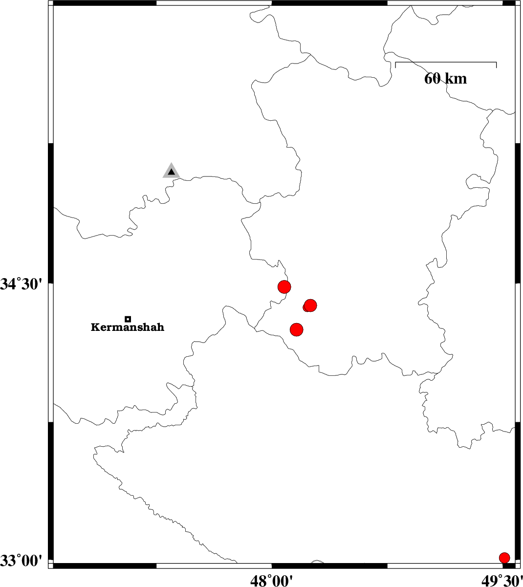 | 2010/10/27 | 15:26:10.6 | 18:56:10.6 | 34.48 | 48.08 | 14 | ML:3.8 | Kermanshah Province, 12 km East of Kangavar | ||
