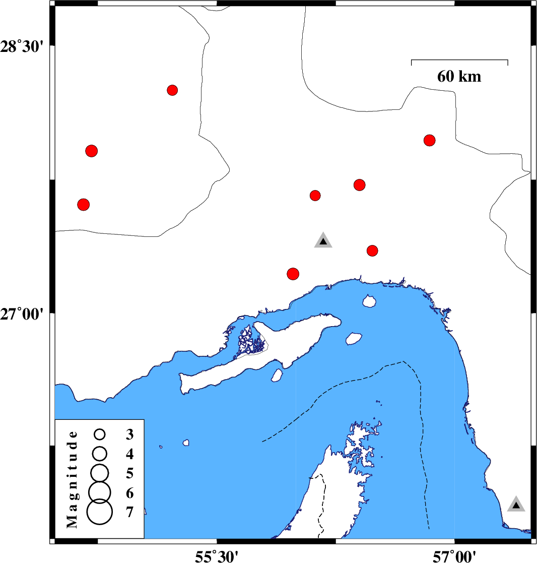| 2010/10/28 | 13:56:11.7 | 17:26:11.7 | 27.22 | 55.98 | 7 | ML:3.4 | Hormozgan Province, 30 km West of Bandar-e abbas | ||