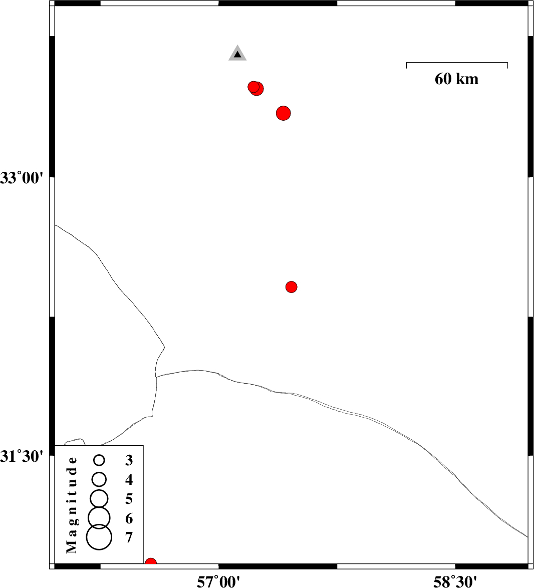 | 2010/10/06 | 23:47:58.2 | 03:17:58.2 | 33.47 | 57.24 | 15 | ML:4 | Yazd Province, 32 km South-East of Tabas |