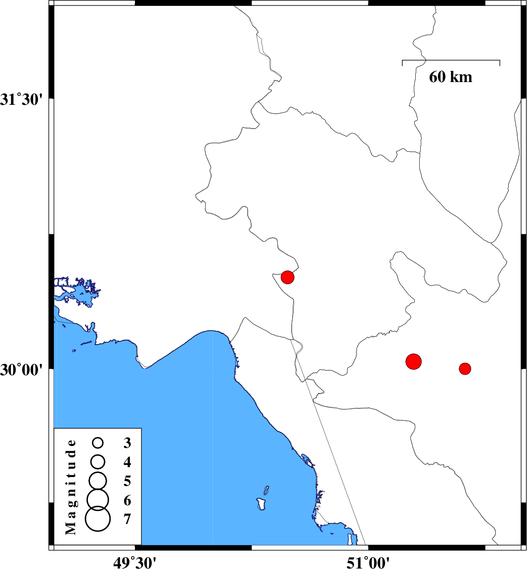 | 2010/10/28 | 09:22:22.4 | 12:52:22.4 | 30.04 | 51.29 | 17 | ML:4.5 | Fars Province, 24 km West of Nurabad |