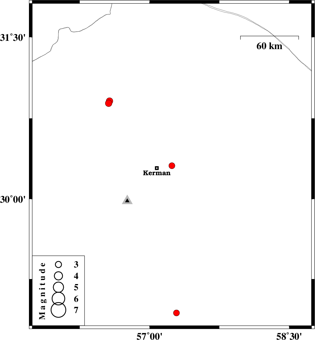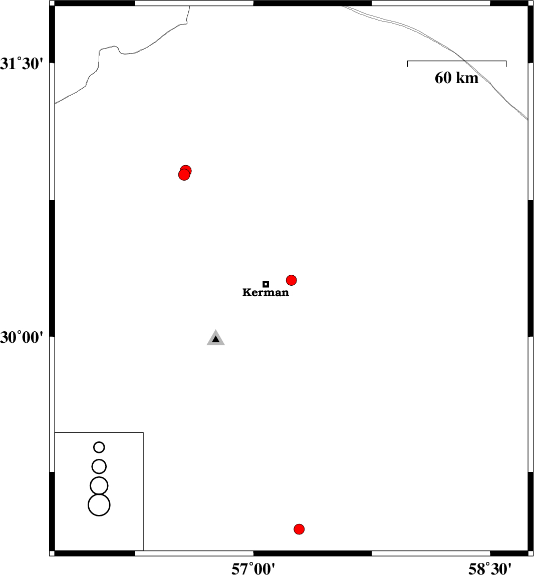 | 2010/10/25 | 05:09:30.8 | 08:39:30.8 | 28.93 | 57.29 | 18 | ML:2.9 | Kerman Province, 52 km North-West of Jiroft | ||