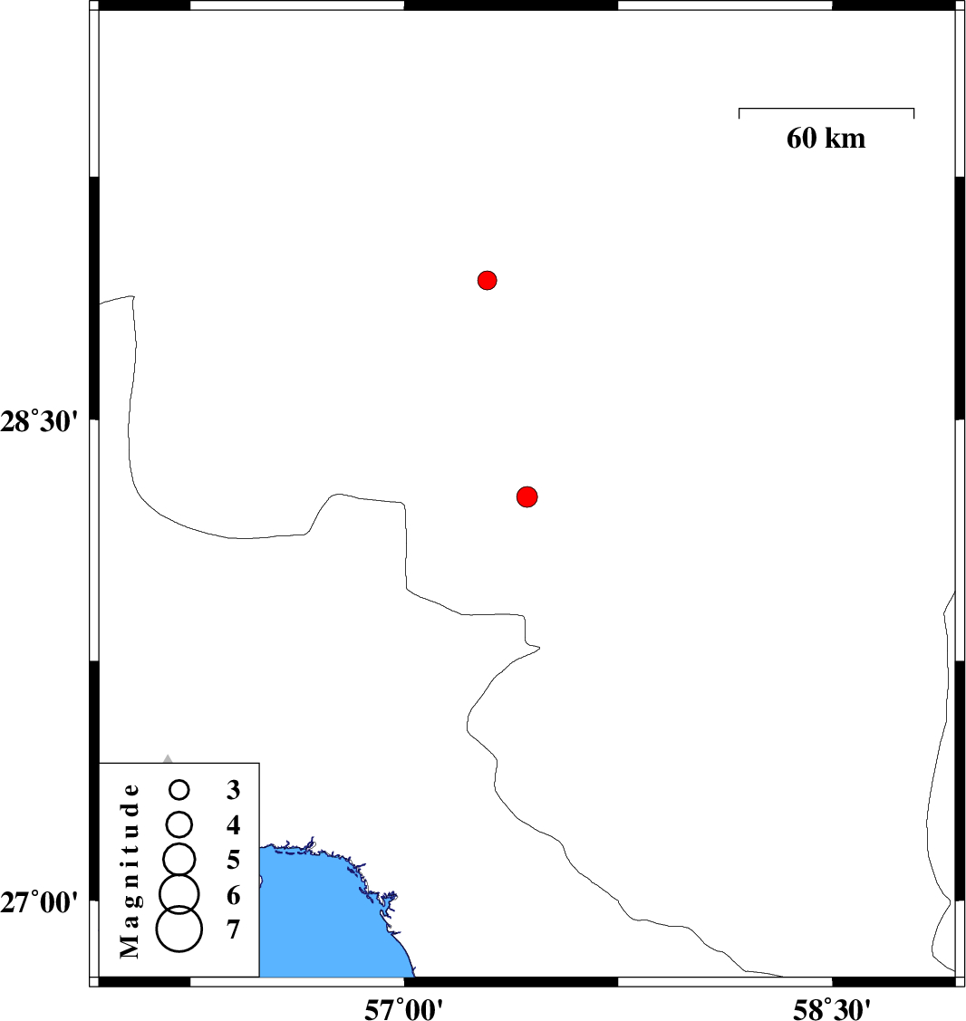 | 2010/10/31 | 13:43:37.8 | 17:13:37.8 | 28.26 | 57.43 | 14 | ML:3.2 | Kerman Province, 43 km North-West of Kahnuj | ||