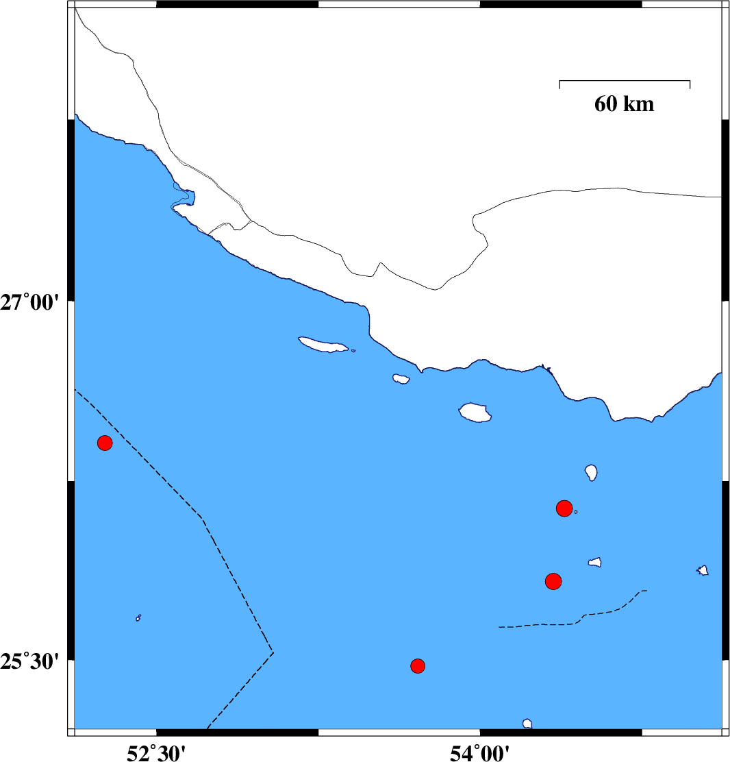 2010/11/01 | 08:34:45.3 | 12:04:45.3 | 26.71 | 53.62 | 46 | ML:3.3 | Persian Gulf, 83 km South-East of Lamerd | ||