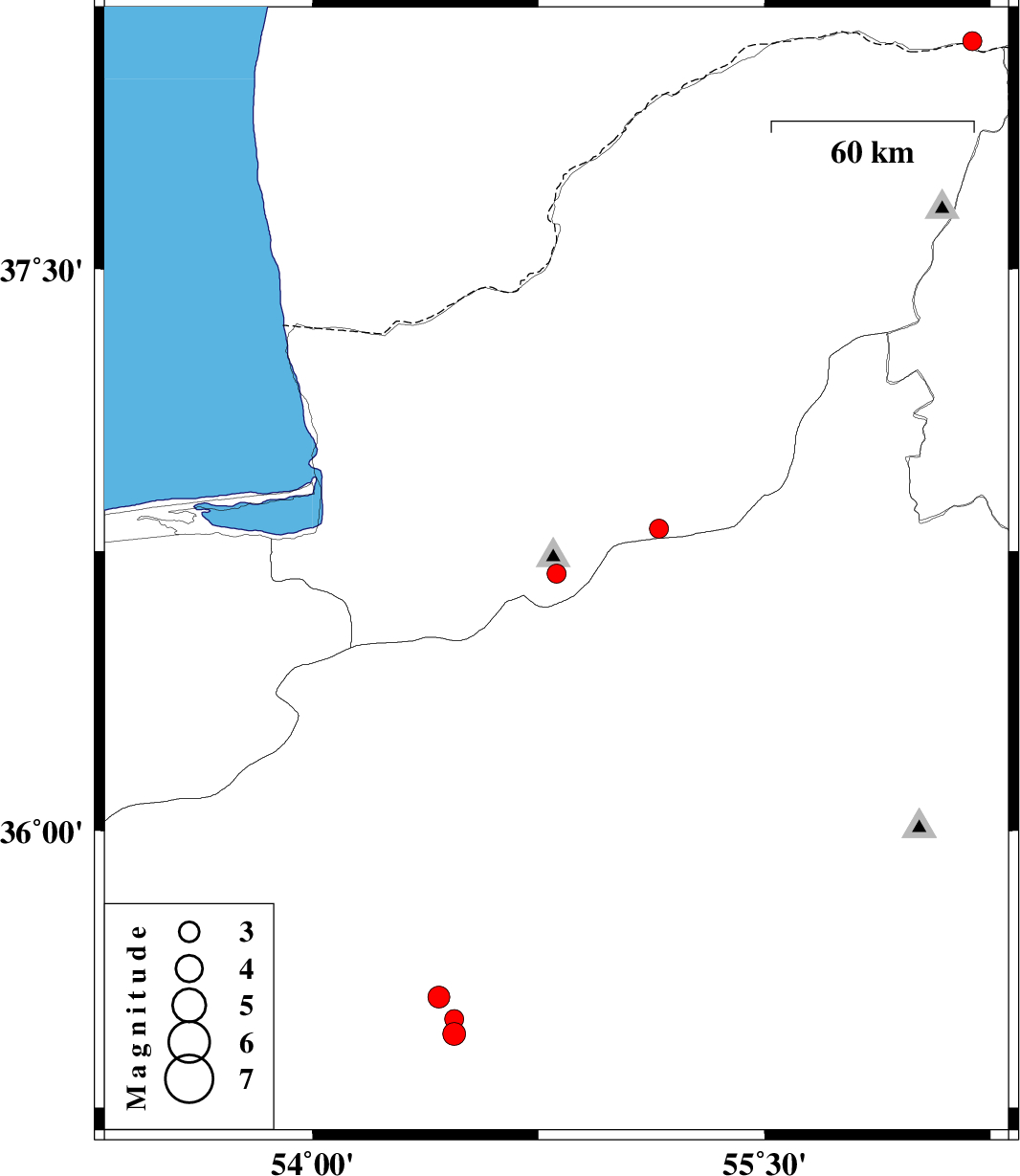 | 2010/10/24 | 06:15:20.1 | 09:45:20.1 | 36.81 | 55.15 | 14 | ML:2.8 | Golestan Province, 23 km South of Ramian | ||