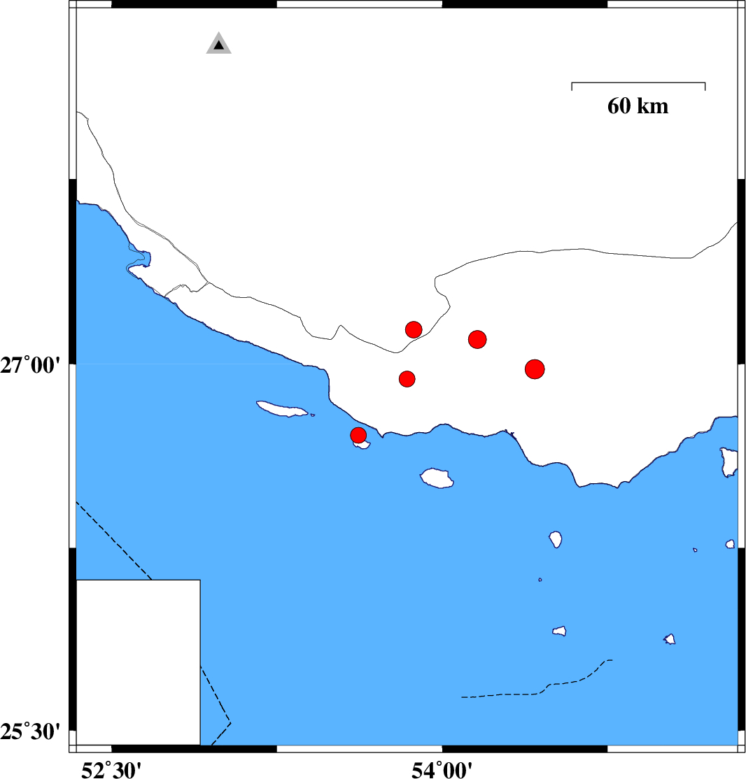 | 2010/11/01 | 08:34:45.3 | 12:04:45.3 | 26.71 | 53.62 | 46 | ML:3.3 | Persian Gulf, 83 km South-East of Lamerd |