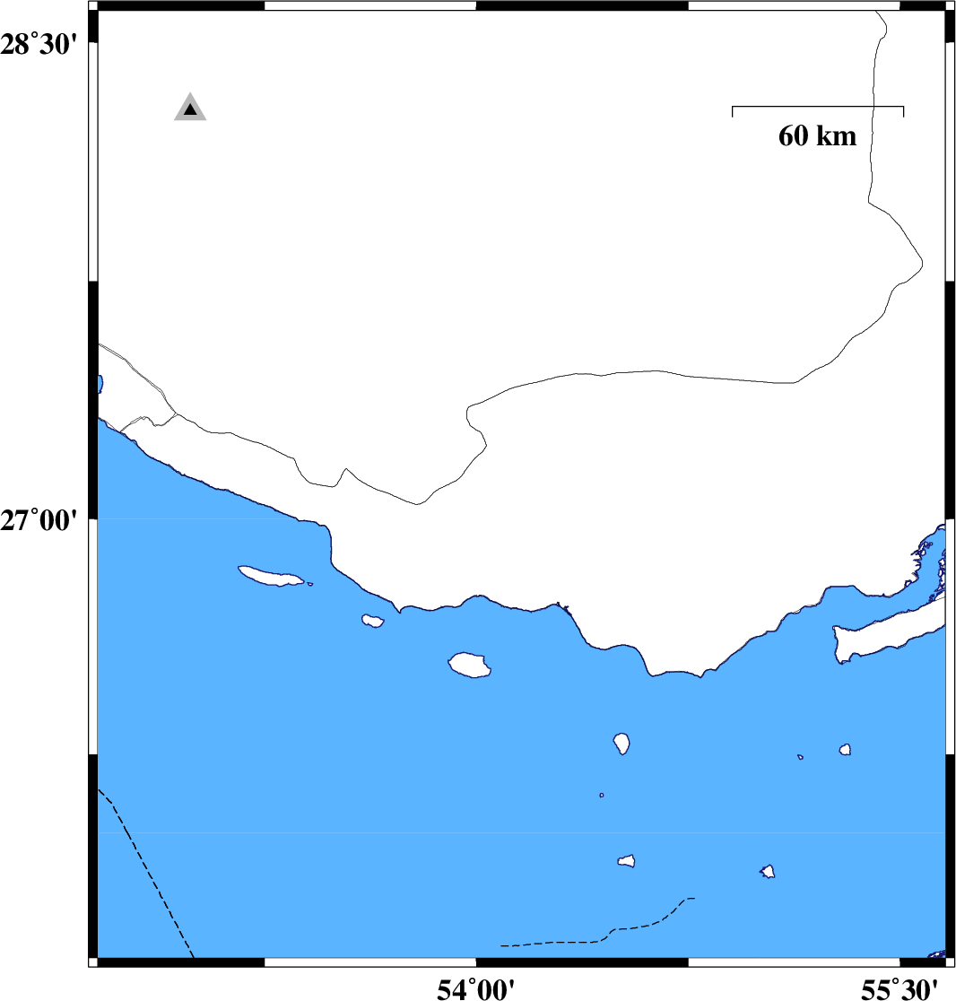 | 2010/11/01 | 08:34:45.3 | 12:04:45.3 | 26.71 | 53.62 | 46 | ML:3.3 | Persian Gulf, 83 km South-East of Lamerd | ||