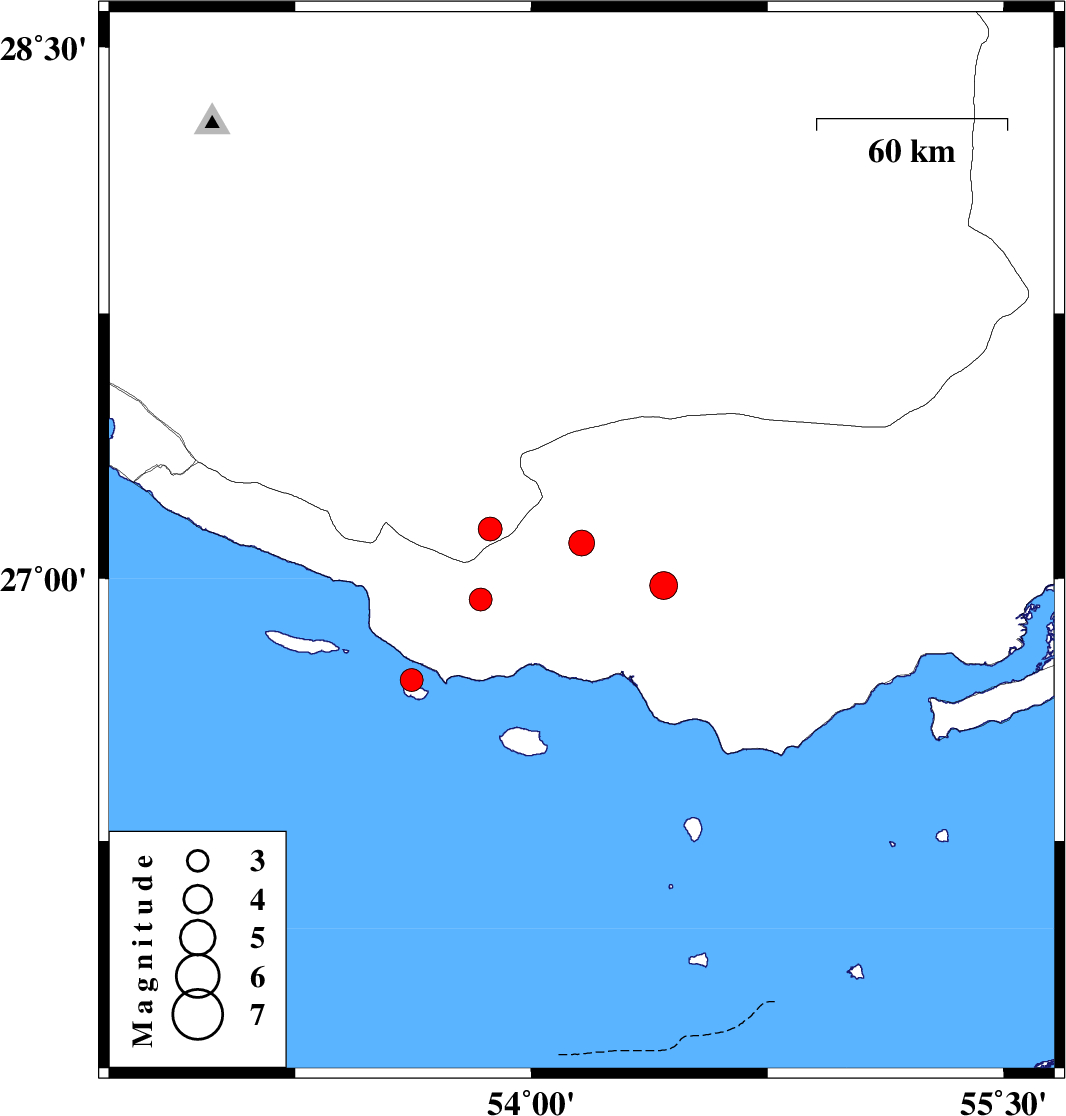 | 2010/11/01 | 08:34:45.3 | 12:04:45.3 | 26.71 | 53.62 | 46 | ML:3.3 | Persian Gulf, 83 km South-East of Lamerd |