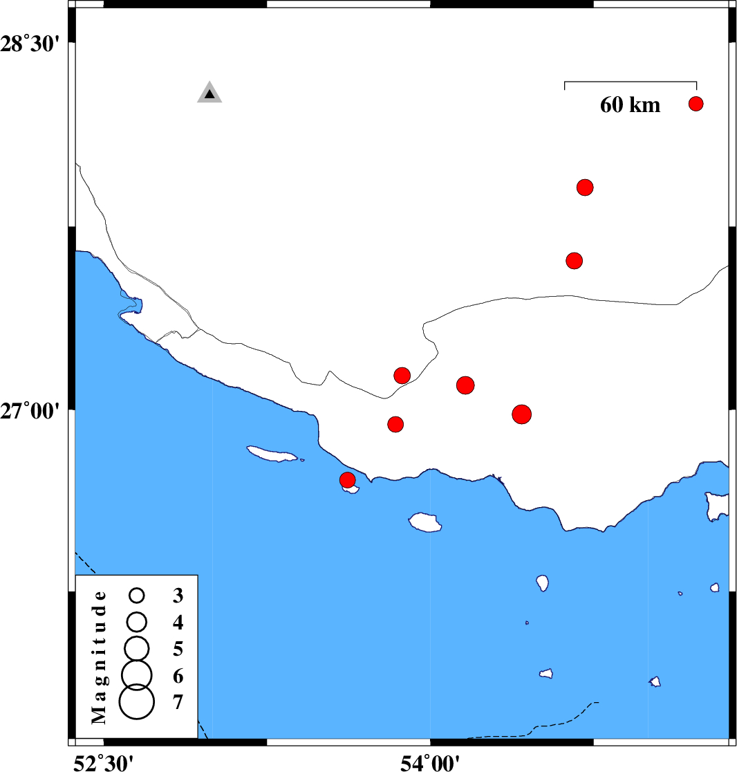| 2010/11/01 | 08:34:45.3 | 12:04:45.3 | 26.71 | 53.62 | 46 | ML:3.3 | Persian Gulf, 83 km South-East of Lamerd | ||