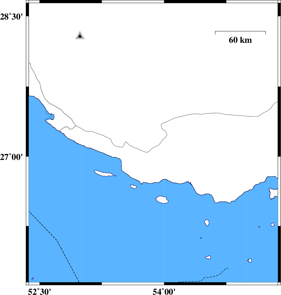 2010/11/01 | 08:34:45.3 | 12:04:45.3 | 26.71 | 53.62 | 46 | ML:3.3 | Persian Gulf, 83 km South-East of Lamerd | ||