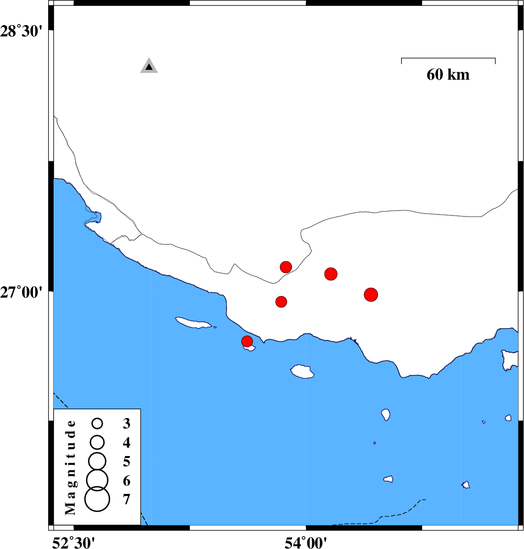 | 2010/11/01 | 08:34:45.3 | 12:04:45.3 | 26.71 | 53.62 | 46 | ML:3.3 | Persian Gulf, 83 km South-East of Lamerd |