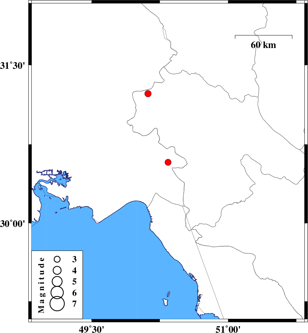 | 2010/11/10 | 00:08:40.2 | 03:38:40.2 | 30.58 | 50.34 | 14 | ML:3.1 | Khoozestan Province, 10 km Behbahan | ||