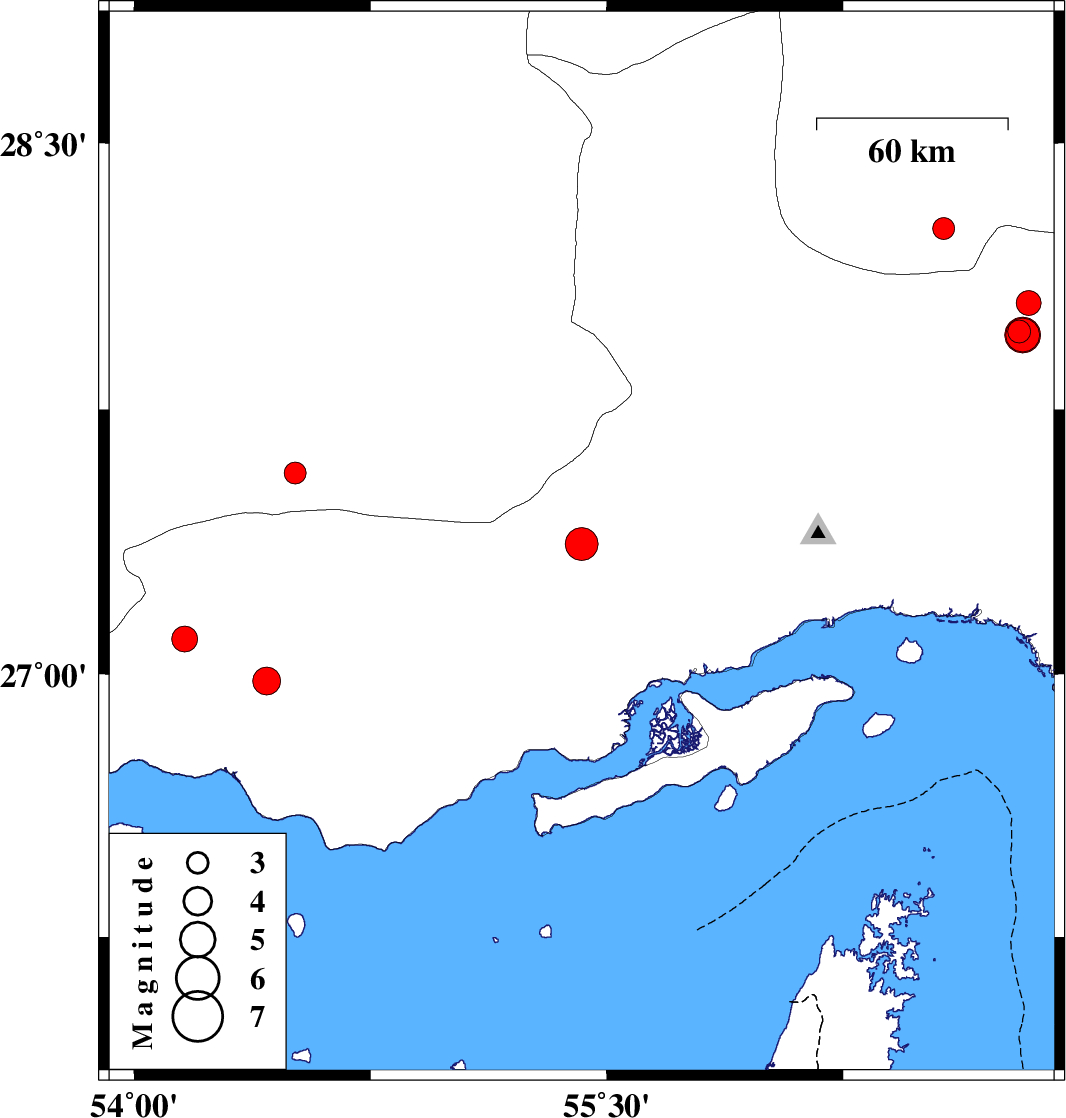 | 2010/11/10 | 13:49:13.4 | 17:19:13.4 | 27.96 | 56.82 | 35 | Mb:5.1 | Hormozgan Province, 86 km West of Kahnuj | ||