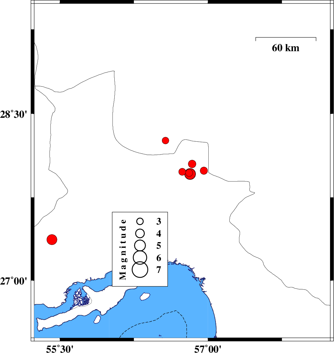 | 2010/11/10 | 13:49:13.4 | 17:19:13.4 | 27.96 | 56.82 | 35 | Mb:5.1 | Hormozgan Province, 86 km West of Kahnuj | ||