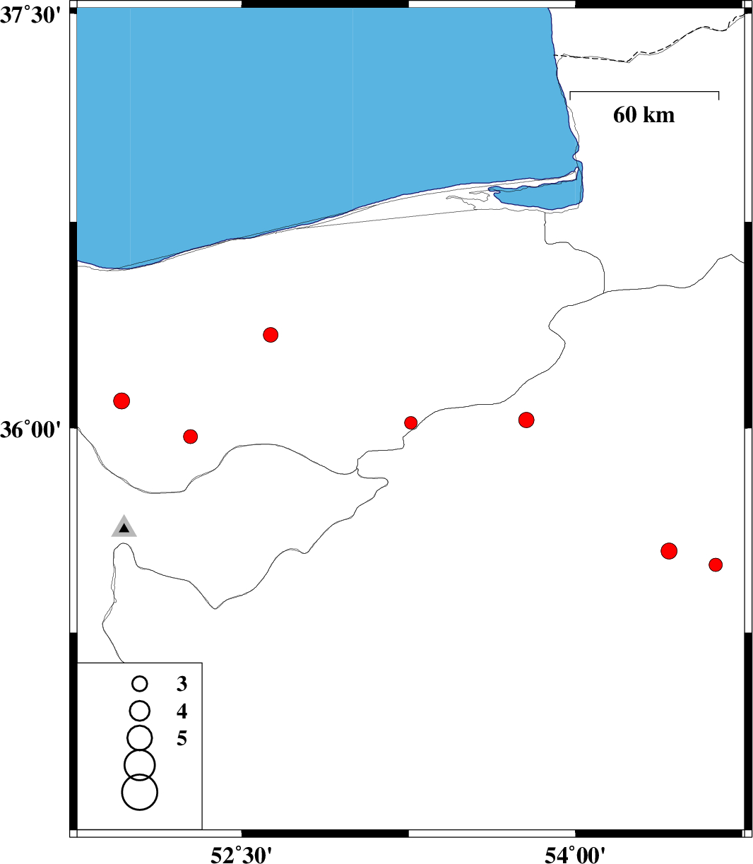 | 2010/11/10 | 03:48:35.7 | 07:18:35.7 | 36.34 | 52.63 | 6 | ML:2.9 | Mazandaran Province, 24 km South of Babol | ||