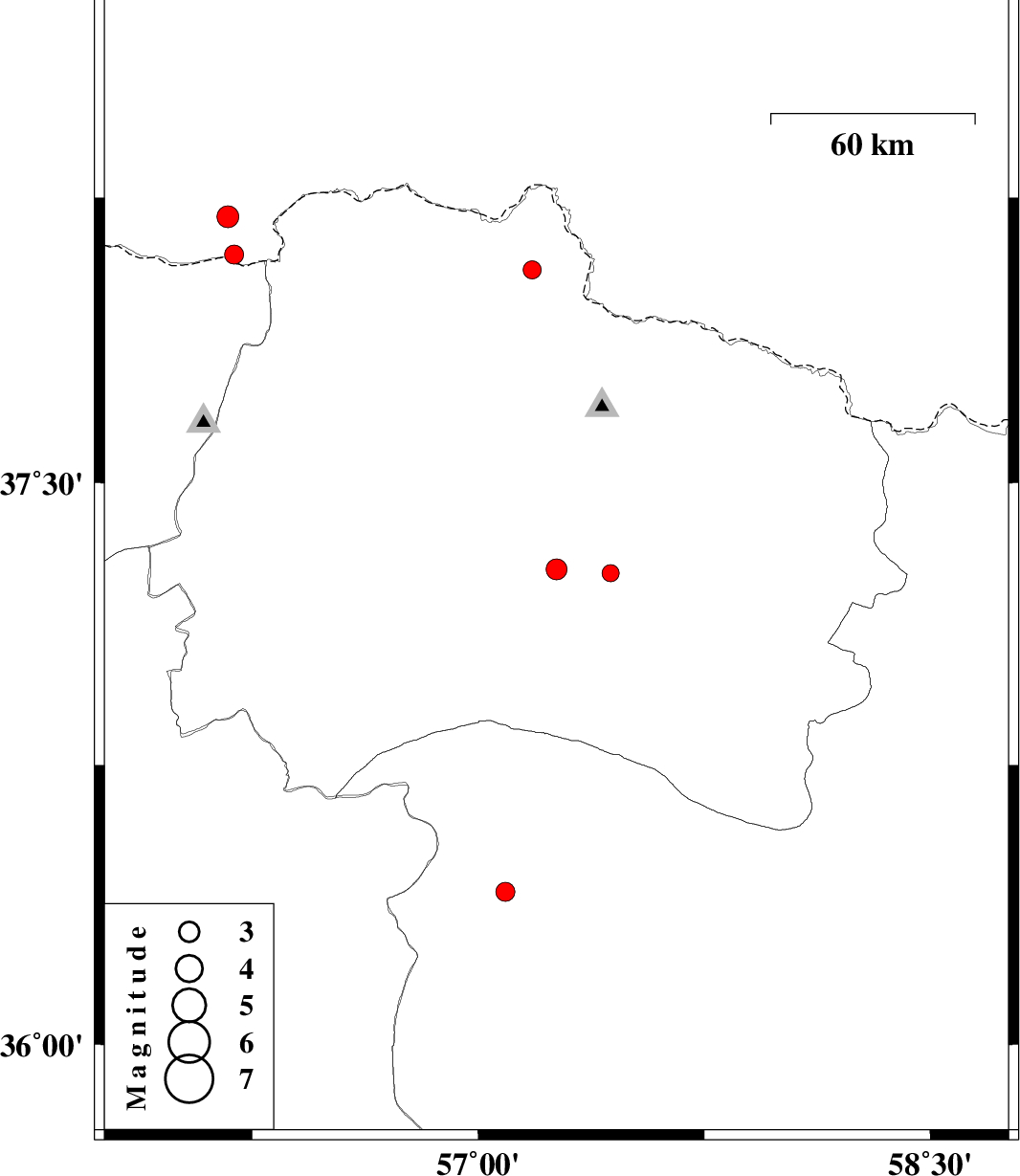 | 2010/11/16 | 01:04:38.7 | 04:34:38.7 | 38.06 | 57.18 | 14 | ML:2.7 | Khorasan(north) Province, 67 km North-West of Bojnurd | ||