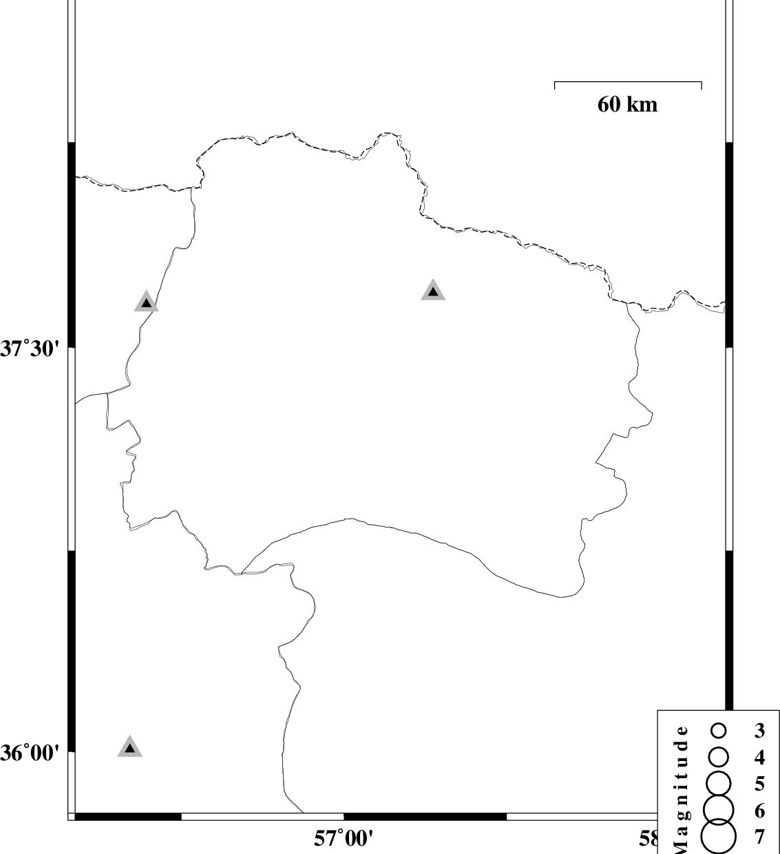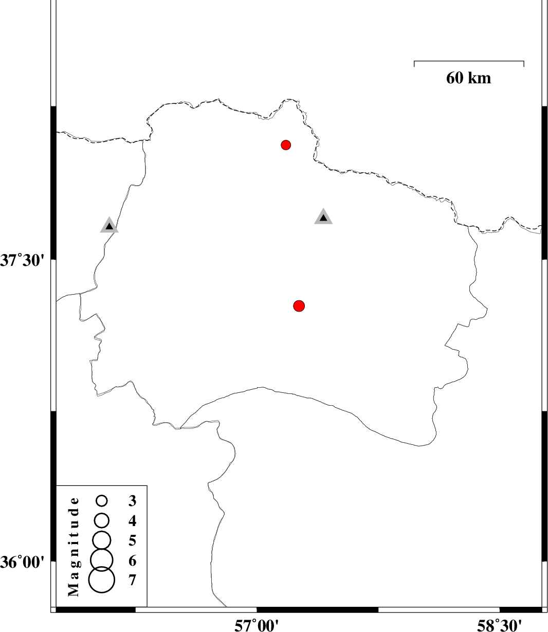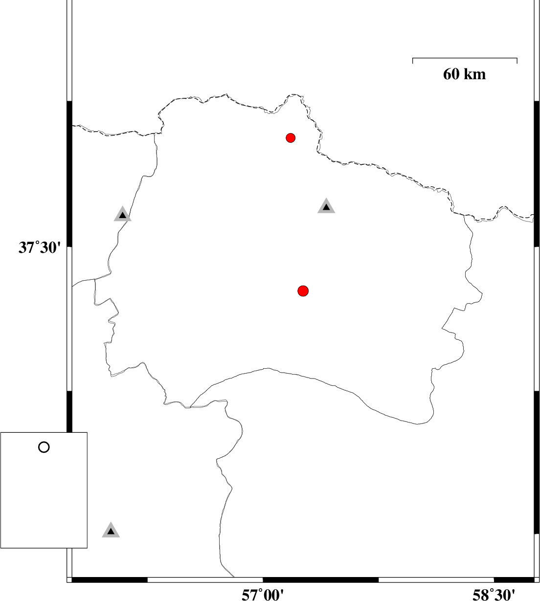 | 2010/11/16 | 01:04:38.7 | 04:34:38.7 | 38.06 | 57.18 | 14 | ML:2.7 | Khorasan(north) Province, 67 km North-West of Bojnurd |