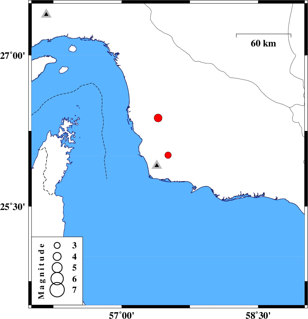 | 2010/11/14 | 14:49:29.7 | 18:19:29.7 | 26.38 | 57.4 | 18 | ML:4 | Hormozgan Province, 92 km South-East of Minab |