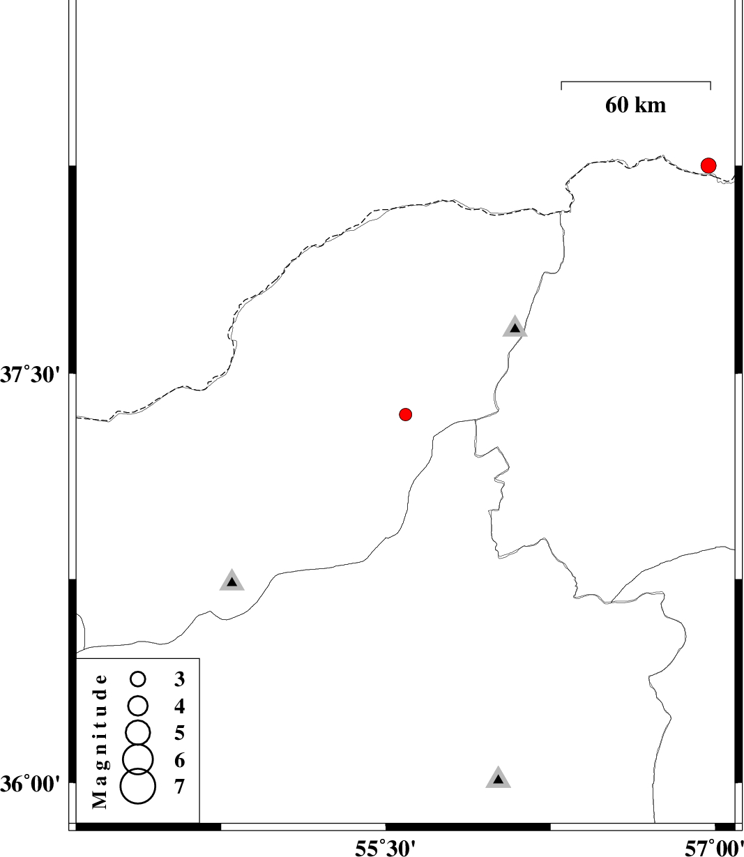 | 2010/11/20 | 03:55:45.8 | 07:25:45.8 | 37.35 | 55.59 | 15 | ML:2.6 | Golestan Province, 9 km Kalaleh |
