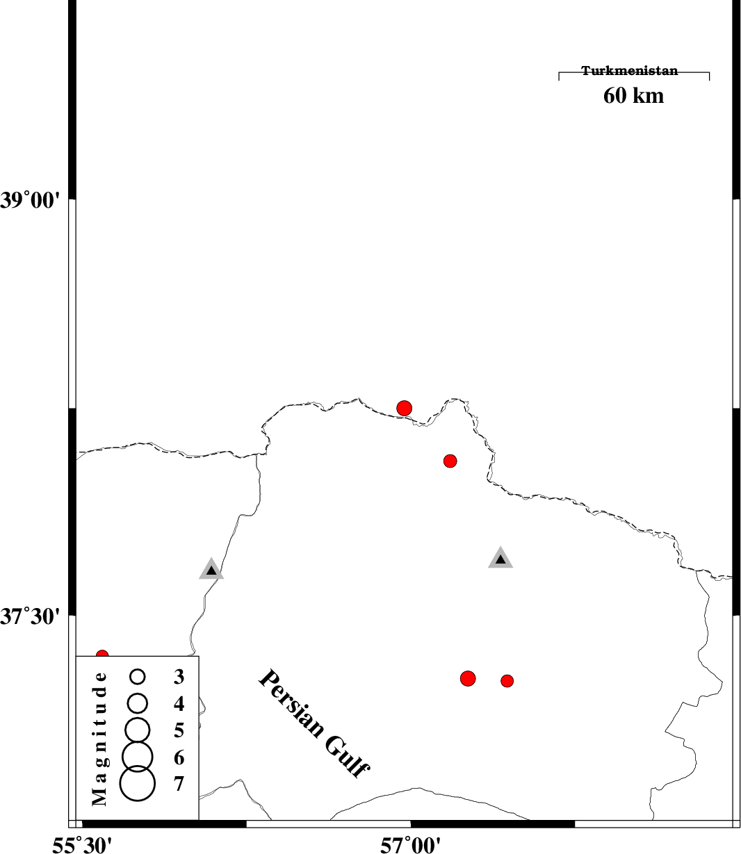 | 2010/11/16 | 01:04:38.7 | 04:34:38.7 | 38.06 | 57.18 | 14 | ML:2.7 | Khorasan(north) Province, 67 km North-West of Bojnurd | ||
