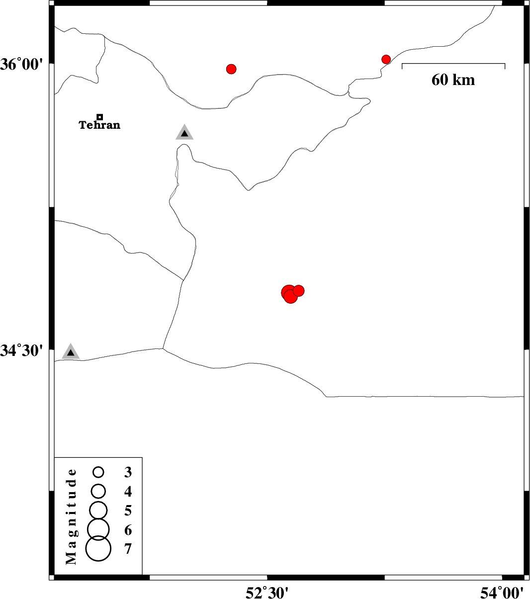 | 2010/11/14 | 20:12:15.2 | 23:42:15.2 | 35.97 | 52.27 | 6 | ML:2.8 | Mazandaran Province, 34 km North-East of Damavand |
