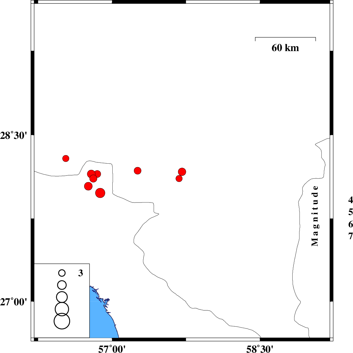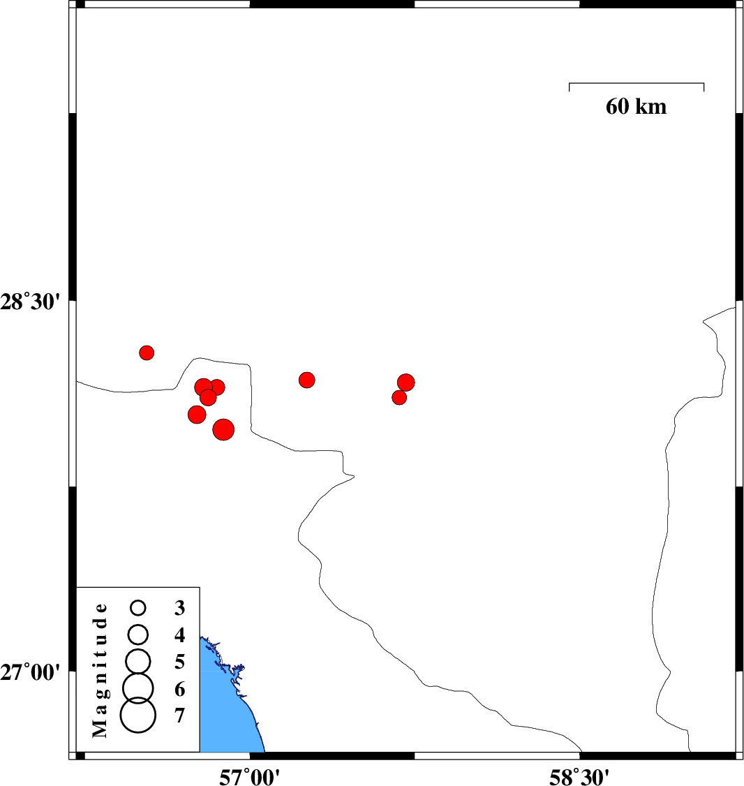 | 2010/11/16 | 13:19:24.4 | 16:49:24.4 | 27.98 | 56.88 | 41 | ML:4.4 | Hormozgan Province, 80 km West of Kahnuj |