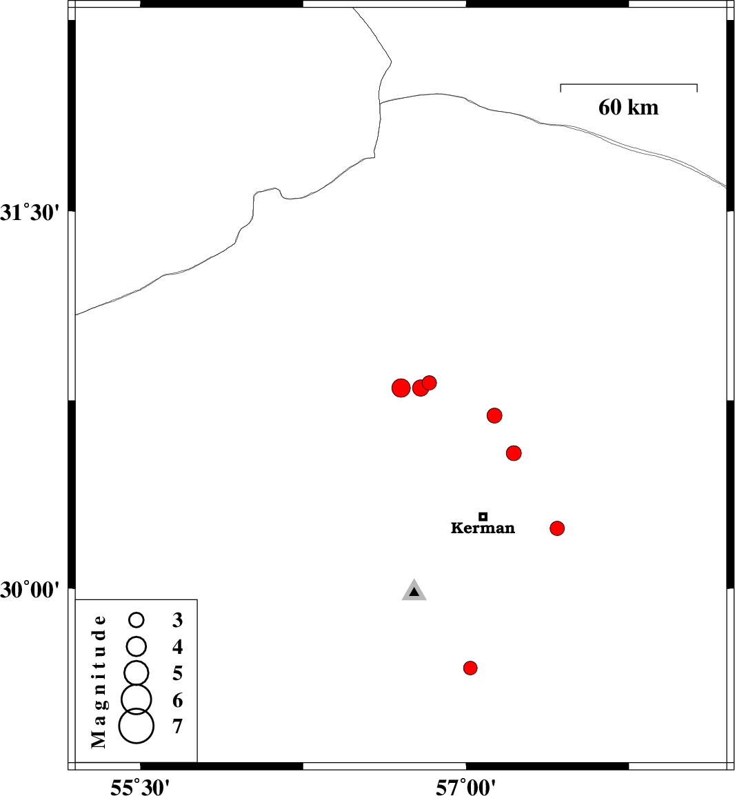 2010/11/20 02:39:52.5 06:09:52.5 30.2457.426 ML:3 Kerman Province, 33 km East of Kerman