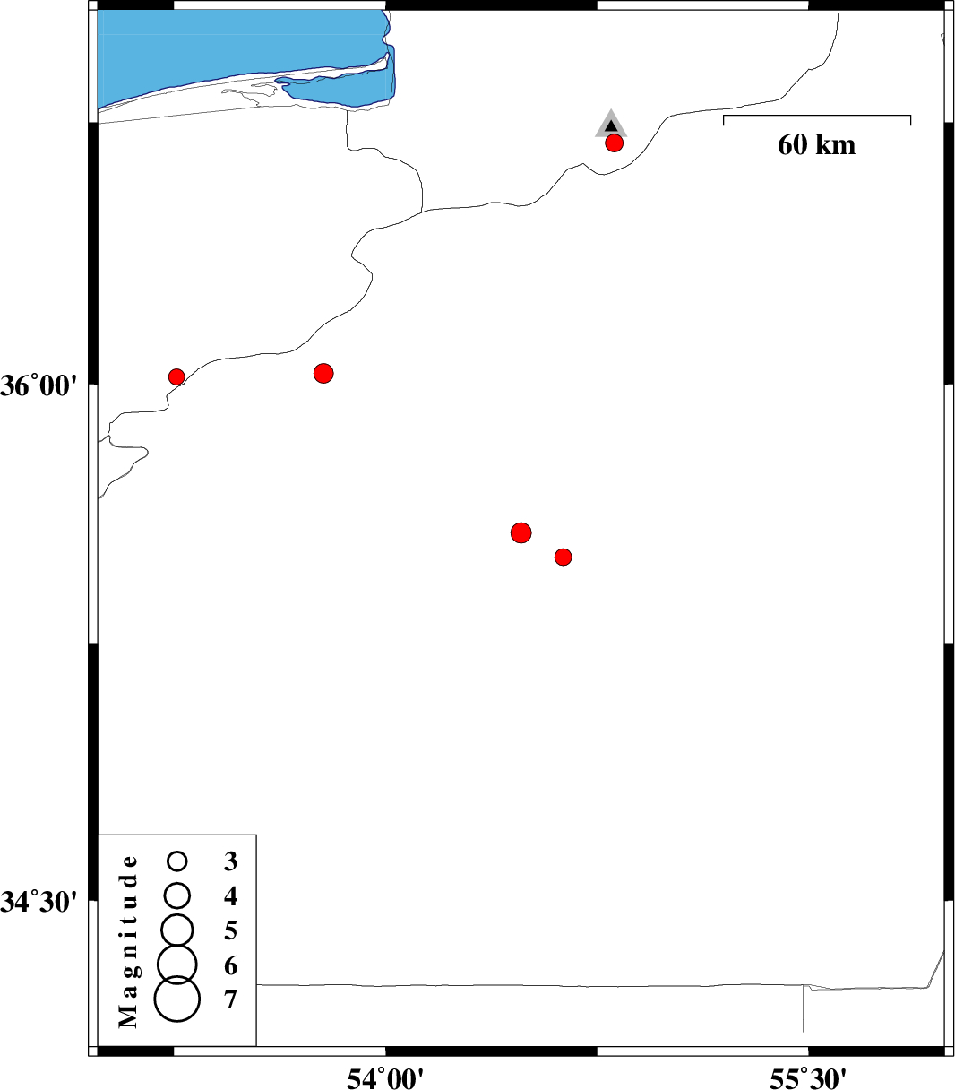 | 2010/11/24 | 13:03:29.2 | 16:33:29.2 | 35.57 | 54.48 | 14 | ML:3.2 | Semnan Province, 67 km South-East of Damghan | ||