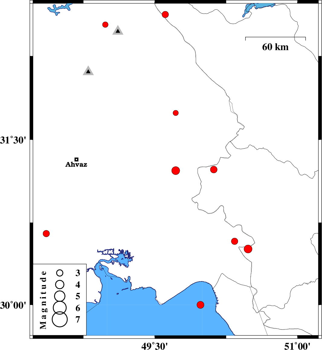 | 2010/11/19 | 13:27:20.5 | 16:57:20.5 | 30 | 49.98 | 44 | ML:3.4 | Persian Gulf, 37 km South-East of Hendijan | ||