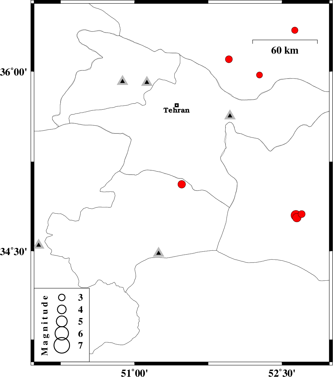 | 2010/11/09 | 01:14:43.5 | 04:44:43.5 | 36.1 | 51.96 | 6 | ML:3.2 | Mazandaran Province, 44 km North-West of Damavand |