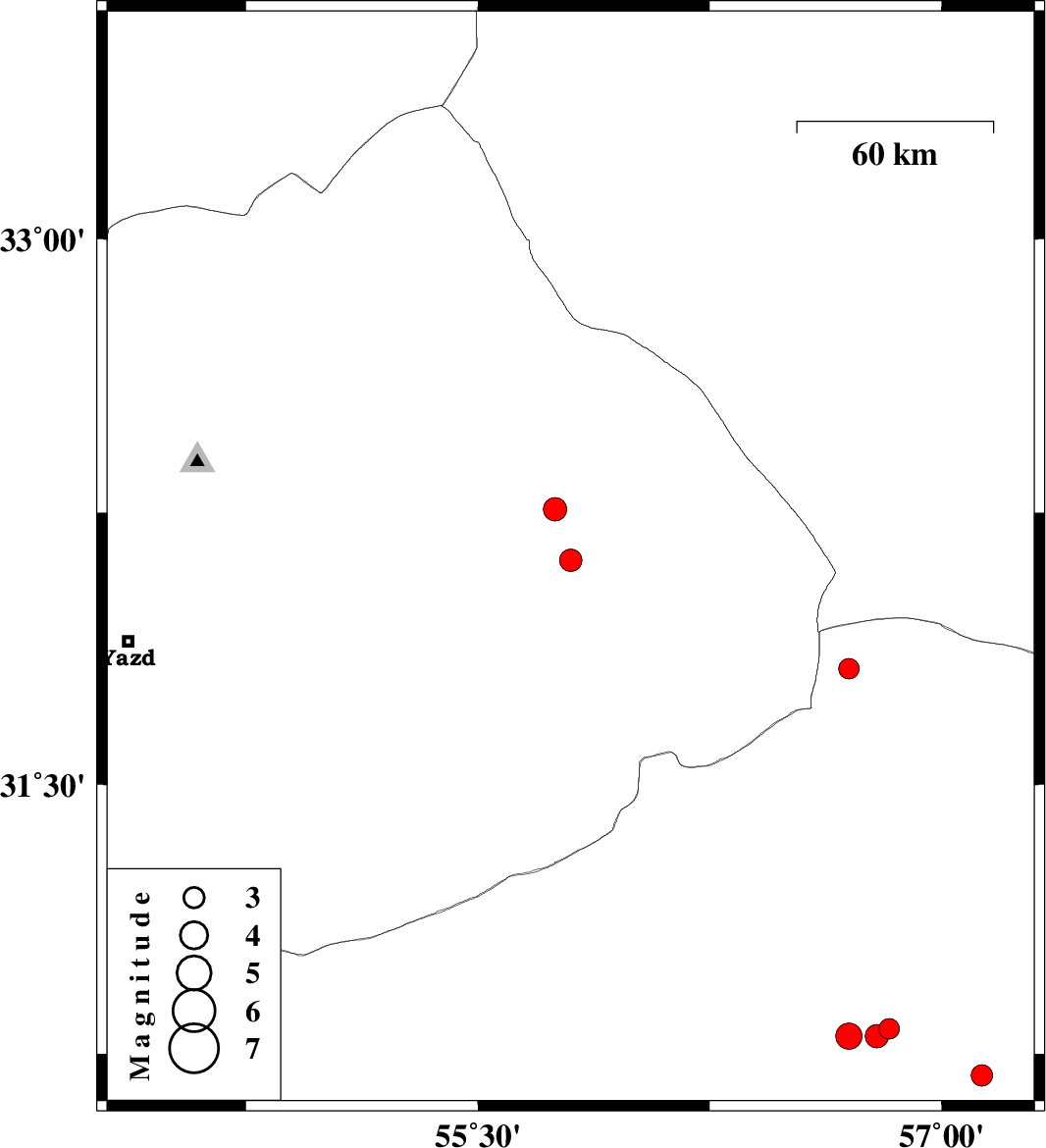 | 2010/11/29 | 11:08:44.6 | 14:38:44.6 | 32.12 | 55.8 | 14 | ML:3.3 | Yazd Province, 69 km North-East of Bafq | ||