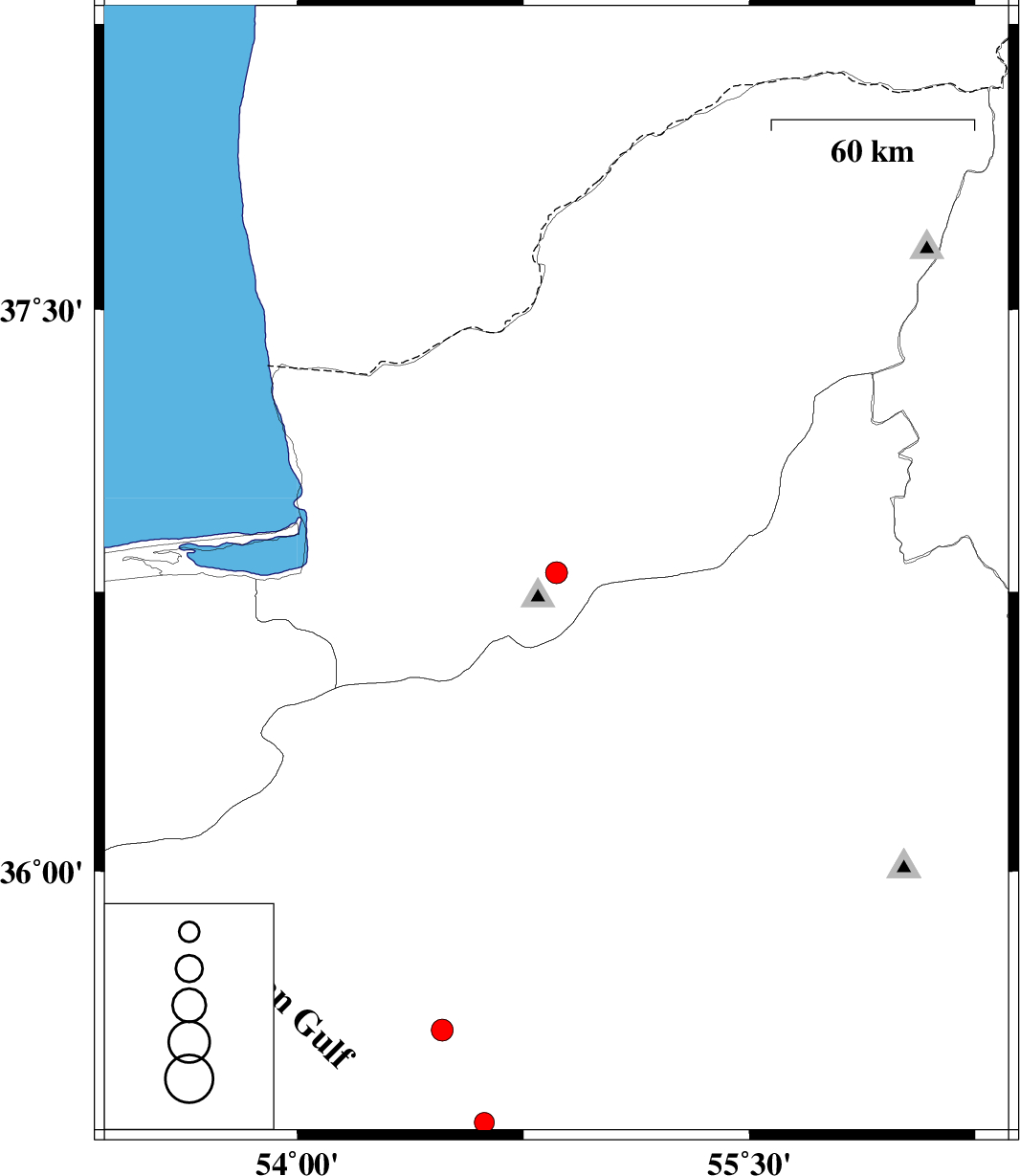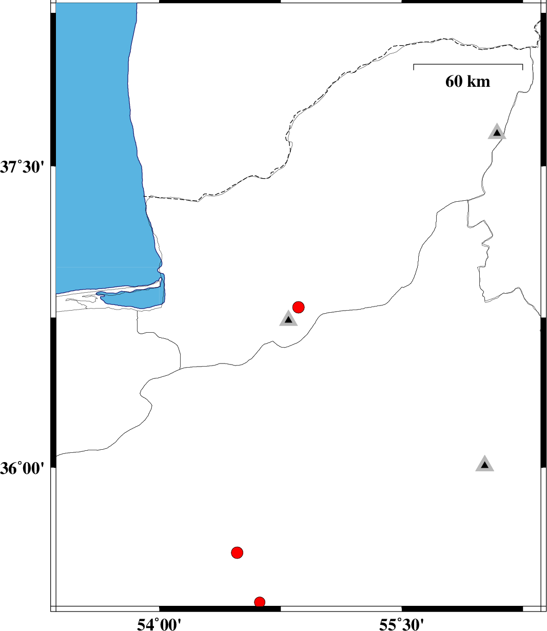 | 2010/11/29 | 15:14:16.5 | 18:44:16.5 | 36.8 | 54.86 | 14 | ML:3.2 | Golestan Province, 12 km South of Ali Abad | ||