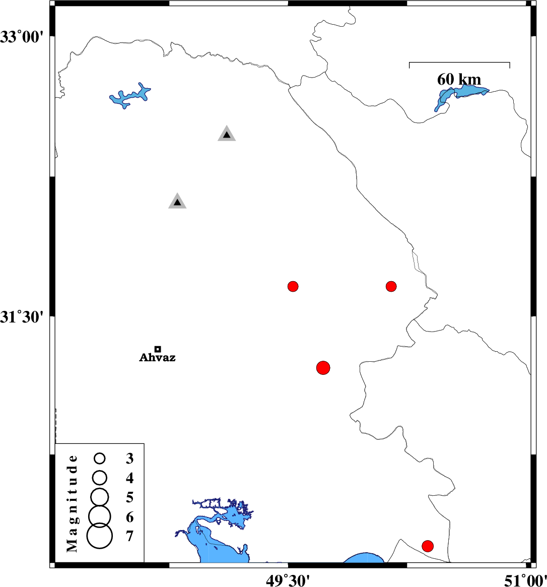 | 2010/11/26 | 01:07:02.4 | 04:37:02.4 | 31.22 | 49.72 | 33 | ML:3.8 | Khoozestan Province, 12 km East of Ramhormoz |