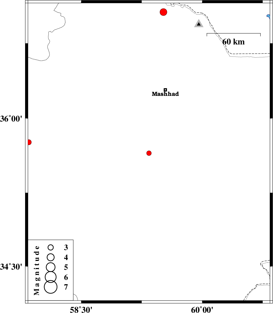 | 2010/11/05 | 23:00:43.3 | 02:30:43.3 | 37.06 | 59.52 | 18 | ML:3.9 | Khorasan(center) Province, 86 km North of Mashhad |