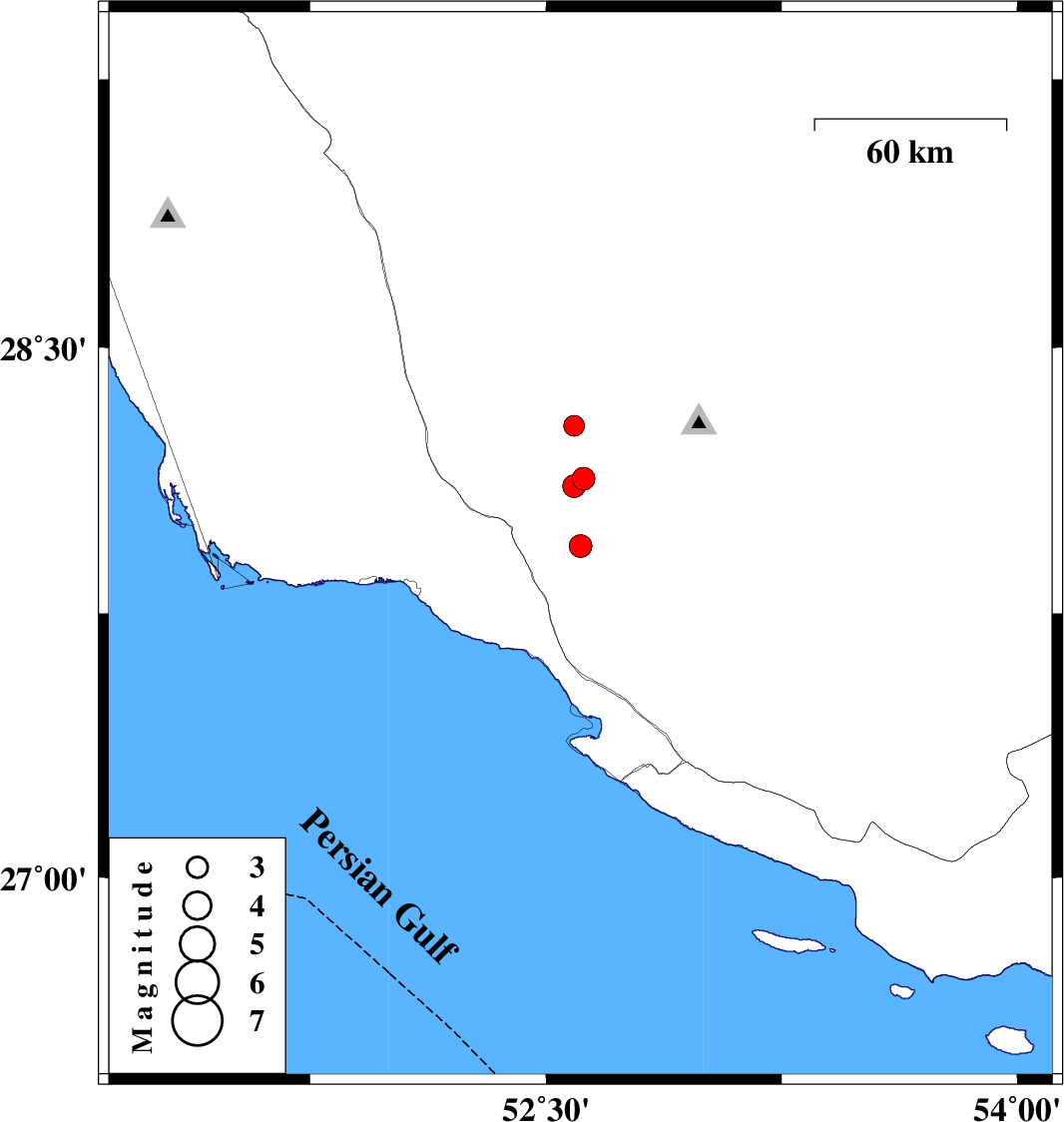 2010/11/30 | 16:01:42.0 | 19:31:42.0 | 28.11 | 52.59 | 14 | ML:3.2 | Fars Province, 41 km North-East of Jam |